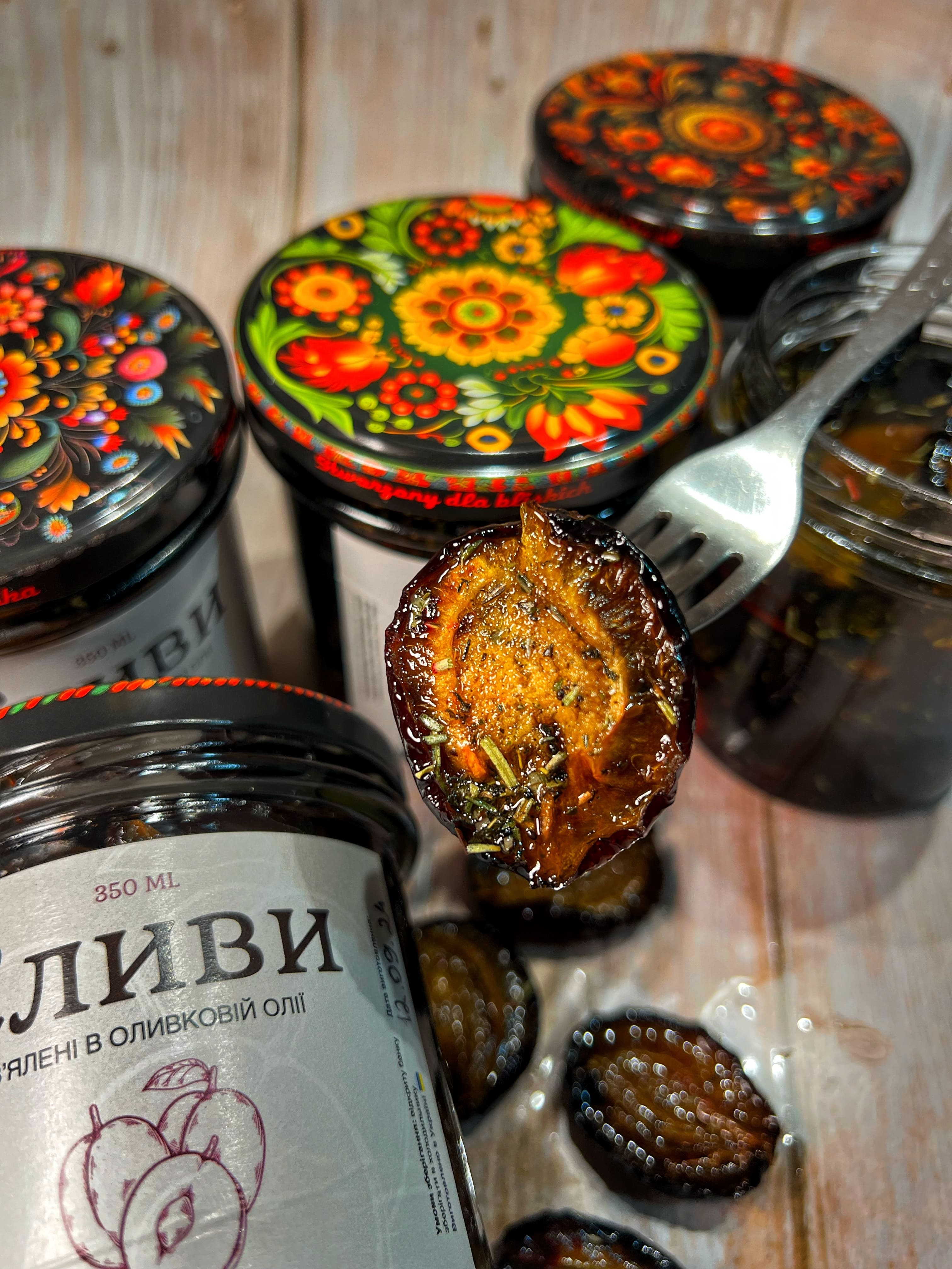 Пряні в'ялені сливи з травами в оливковій олії з часником і, опціонально, з перцем, є в чотирьох варіантах гостроти: не гострі, помірно гострі, гострі і пекельно гострі
